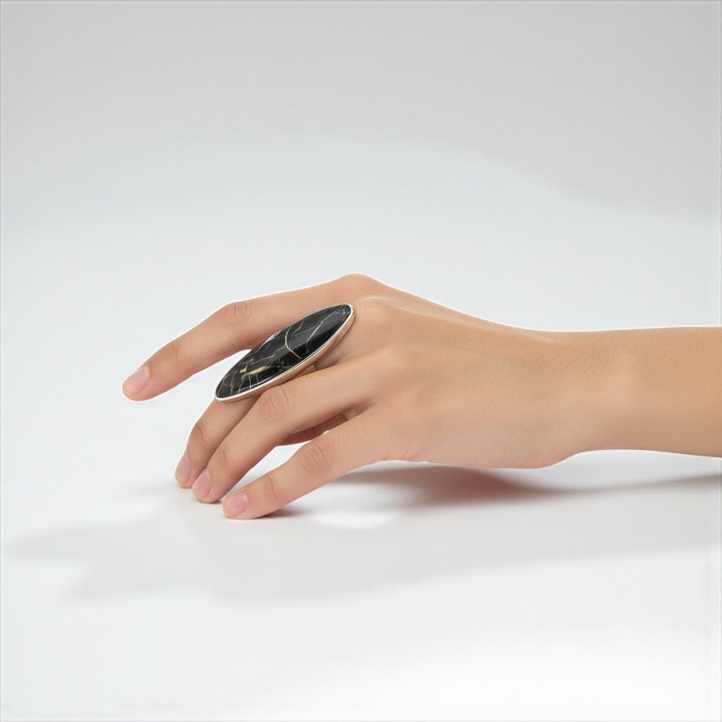This unique statement piece was handcrafted by artist Humberto Juarez de la Camara. It features a stunning Onyx stone sourced in Salta, Argentina and bright silver-grey alpacca that adds elegance to any outfit.